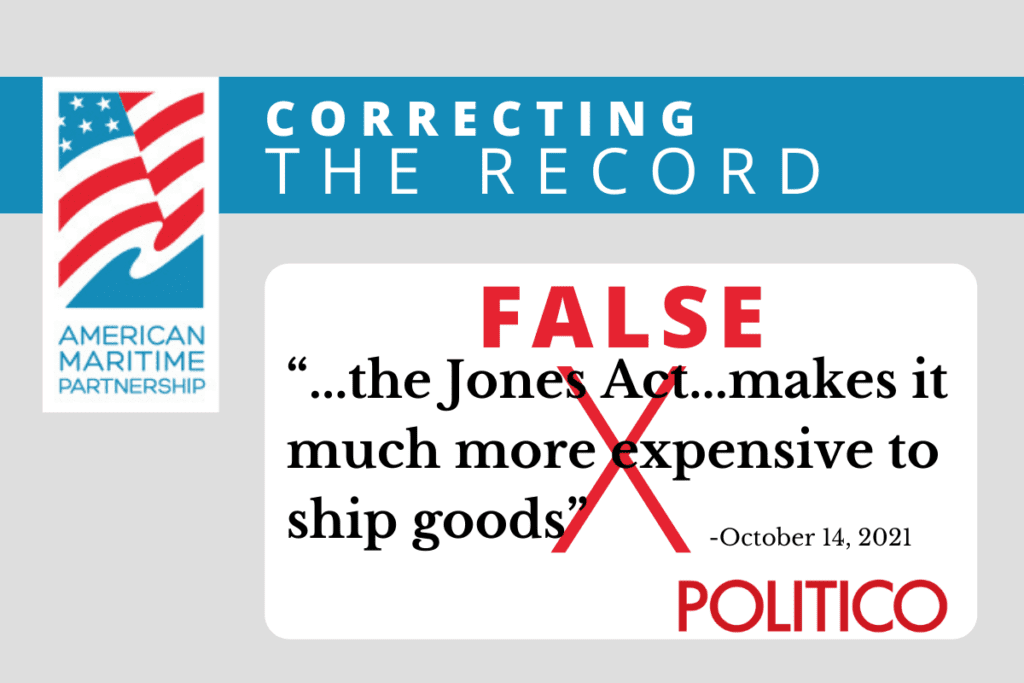 Truth: This is blatantly false. Domestic maritime provides reliable and stable service to American consumers and customers. Between 2019 and 2021, international carriers raised their rates over ten times, by up to 700% in total, while American maritime has kept rates steady. — In response to the article: Politico: “What […] read more →
