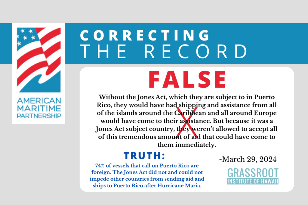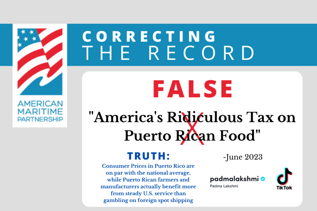 Truth: The Jones Act ensures reliable service between Puerto Rico and the mainland United States and does not prohibit foreign carriers from traveling from their country of origin to import goods into Puerto Rico. In fact, on average, nearly two-thirds of the vessels that call on the Port of San […] read more →